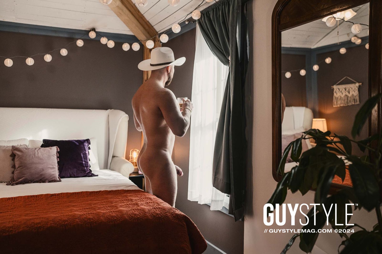 With a tantalizing grin, the Cowboy slowly slid his thong off, revealing his glorious, naked form bathed in the soft light. His body, a testament to raw power and unbridled passion, was now the centerpiece of the cabin, illuminated by the whimsical string lights that adorned the room. Maxwell's camera captured every inch of his exposed skin, every ripple of muscle, immortalizing the moment of pure, unadulterated freedom.